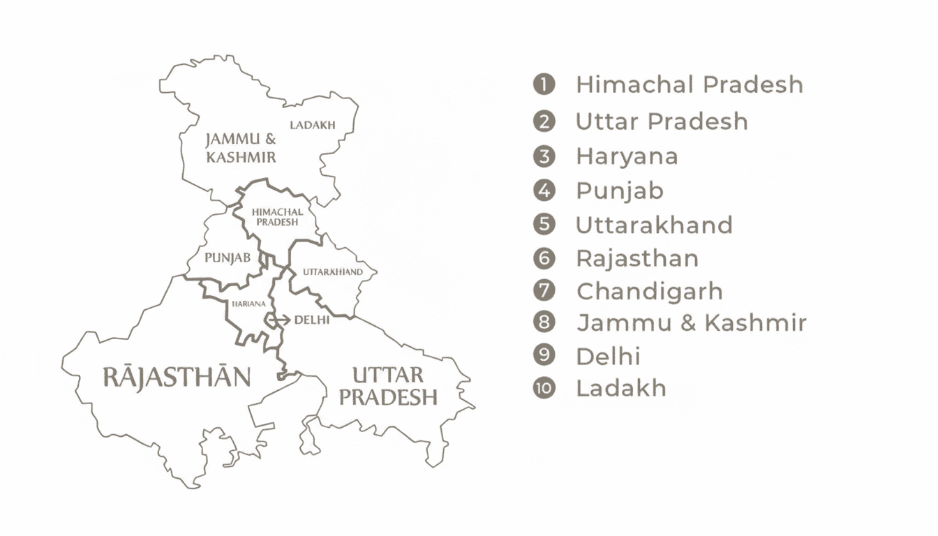 Nordindien umfasst typischerweise acht Bundesstaaten und vier Unionsterritorien. Haryana, Himachal Pradesh, Punjab, Rajasthan, Uttar Pradesh und Uttarakhand sind die Bundesstaaten und die Reste (Jammu und Kaschmir, Ladakh, Chandigarh und Delhi) sind Unionsterritorien. Die Beschreibung von Nordindien kann unterschiedlich sein, manche Klassifikationen sind etwas anders.
